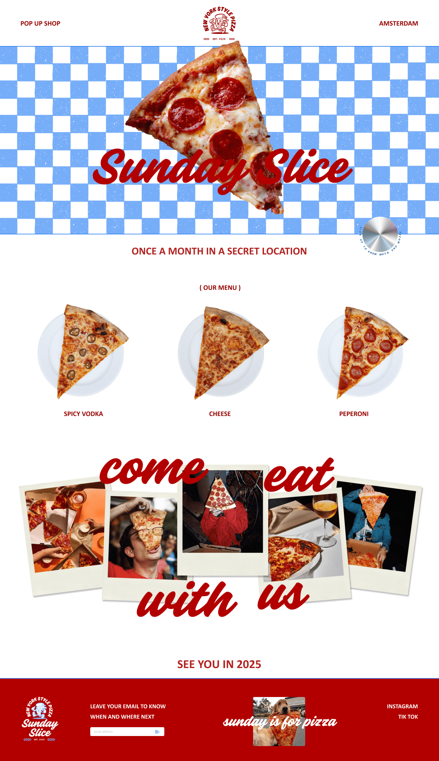 I had the opportunity to create the branding and website for Sunday Slice, a pop-up event restaurant in Amsterdam serving authentic New York-style pizza. True to its name, Sunday Slice will appear in random locations across the city on select Sundays in 2025, revealing the secret spot and time exclusively to its members just a week in advance, adding a playful and exclusive twist to the pizza experience.